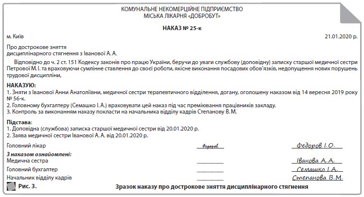 У наказі обов’язково зазначають підставу для дострокового зняття догани, як-от: