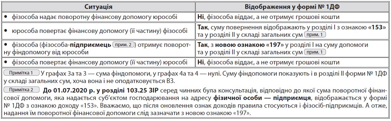 Поворотна фіндопомога надана й отримана Для цілей заповнення форми № 1ДФ значення має кожне нарахування фізособі або отримання фізособою грошових коштів у вигляді фіндопомоги. Причому операція може не спричинювати виникнення зобов’язань з ПДФО та ВЗ, але у формі № 1ДФ її треба зафіксувати. Зокрема, йдеться про основну суму поворотної фінансової допомоги. До 01.07.2020 р. (зокрема, при звітності за ІІ квартал) з ознакою доходу «153» ми відображали: