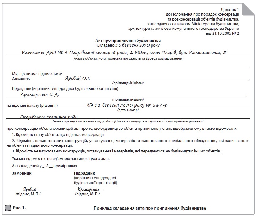 Після складання розпорядчого документа замовник будівництва разом із підрядником у місячний термін зобов’язані підписати акт про припинення будівництва, форма якого затверджена Положенням № 2 (додаток 1). Приклад заповнення див. на рис. Окрім того, має бути підготовлено пакет документів, перелік яких наведено в п. 3.1 розд. 3 Положення № 2, щодо закриття об’єкта будівництва та збереження його схоронності під час консервації, що є невід’ємною частиною акта.