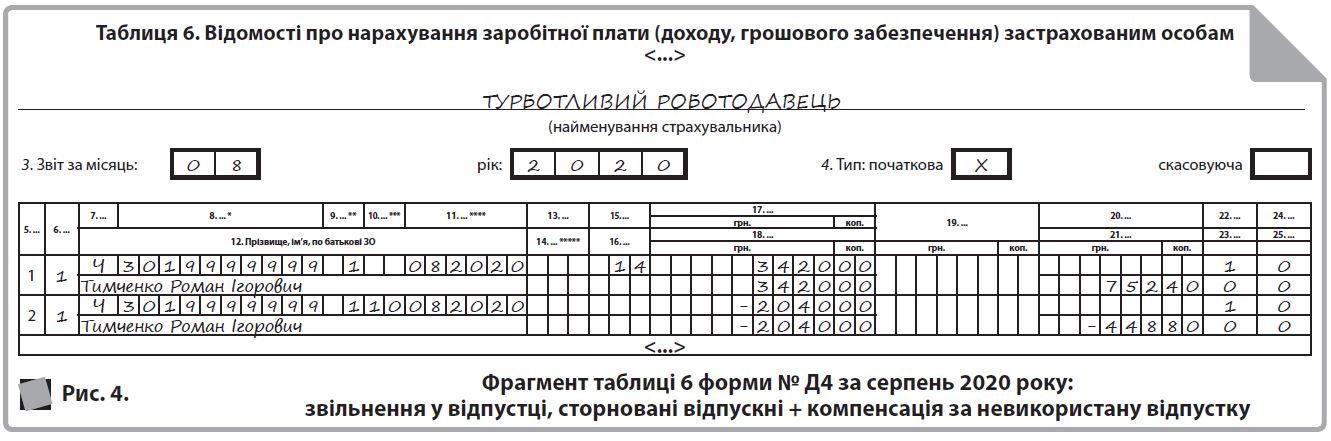 Приклад 4. Працівнику (основне місце роботи; без інвалідності; не держслужба) надана щорічна основна відпустка з 28 липня 2020 року на 24 к. дн. (по 20 серпня 2020 року). Уся сума відпускних була виплачена і нарахована в липні: 1360,00 грн за 4 к. дн. липня і 6800,00 грн за 20 к. дн. серпня (відпускні за дні серпня показані в окремому рядку таблиці 6 форми № Д4 за липень 2020 року). Проте, перебуваючи у відпустці, працівник звернувся до керівника із заявою про звільнення за власним бажанням 14 серпня 2020 року. Керівник погодив заяву. При проведенні остаточного розрахунку в серпні 2020 року відсторновані відпускні за 6 к. дн. серпня в сумі 2040,00 грн (ЄСВ відсторновано в сумі 448,80 грн), нарахована компенсація за 10 к. дн. невикористаної відпустки в сумі 3420,00 грн6 (нарахований ЄСВ — 752,40 грн).