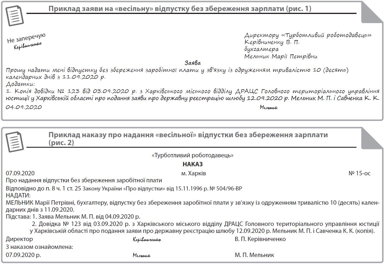 Після написання заяви працівником та подання відповідних документів керівник видає наказ (рис. 2). У документах про надання такої відпустки слід послатися на п. 8 ч. 1 ст. 25 Закону про відпустки. На відміну від заяви, наказ можна видати зведений про надання відпусток без збереження зарплати для нареченого та нареченої. Таку можливість надають норми абз. 5 та 6 п. 7 гл. 9 розд. II Правил № 1000/52.