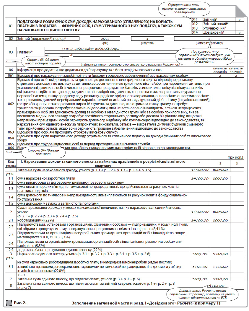 Это исходит из того, что согласно Порядку № 4 «Довідковий» Расчет подают в составе Расчета с типом «Звітний». Но ждем официальную позицию. Такие сведения попадают в систему исключительно в качестве справочной информации. Как заполнять заглавную часть Расчета такого типа, Порядок № 4 не уточняет. Считаем, что тут нужно действовать, как и в случае подачи нового отчетного и уточняющего расчетов: заполнять только стр. 01–06 заглавной части.