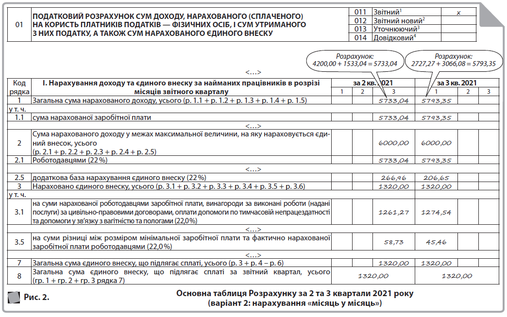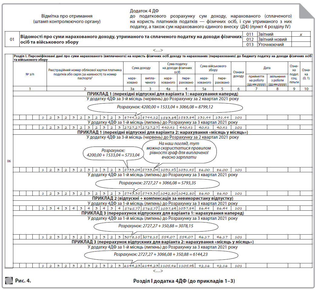 - варіант 2: нарахування «місяць у місяць» (основна таблиця Розрахунку на рис. 2, додаток Д1 на рис. 3, розд. І додатка 4ДФ на рис. 4).