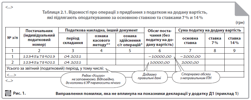 Приклад 1. Заповнюючи таблицю 2.1 додатка Д1 за квітень 2021 року, платник ПДВ зазначив неправильний ІПН контрагента: потрібно було вказати «123456789012», а вказав «123456789013». Обсяг постачання у ПН склав 10 тис. грн без урахування ПДВ (ставка 20 %).