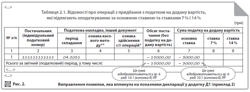 Приклад 2. Платник ПДВ (покупець) помилково включив до додатка Д1 (таблиця 2.1) за квітень 2021 року ПН (складена у квітні 2021 року) за контрагентом «111111111111» з обсягом постачання 15000,00 грн, ПДВ — 3000,00 грн. Після спливу граничного терміну подання декларації з ПДВ за квітень виявилося, що ПН була зареєстрована із порушенням граничного строку реєстрації. Відповідно, права на ПК у квітні за нею не виникло.
