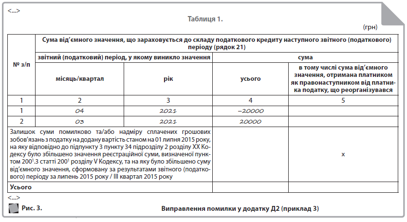 Приклад 3. У червні 2021 року підприємство виявило, що припустилося помилки під час заповнення таблиці 1 додатка Д2 до декларації за квітень 2021 року, а саме неправильно зазначили період, в якому виникло від’ємне значення. У додатку вказано: 45000 грн — 04.2021, а слід було: 25000 грн — 04.2021, 20000 грн — 03.2021.