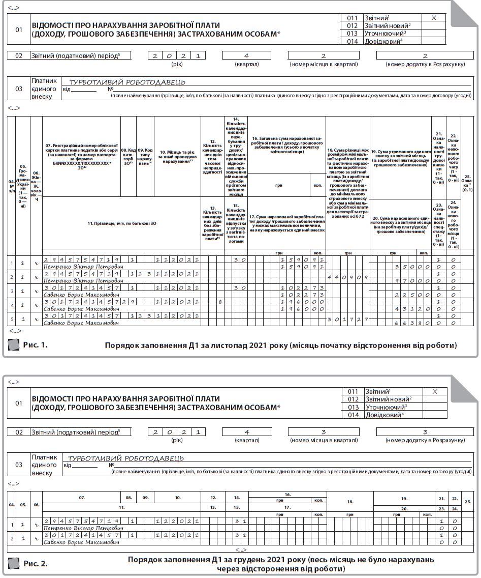 У Д1 за грудень 2021 року, коли працівникам не проводилися нарахування, на них заповнюються рядки без сумових показників, але із зазначенням днів перебування у трудових відносинах. Адже, як зазначалося вище, попри відсторонення від роботи працівники залишаються у трудових відносинах з роботодавцем.