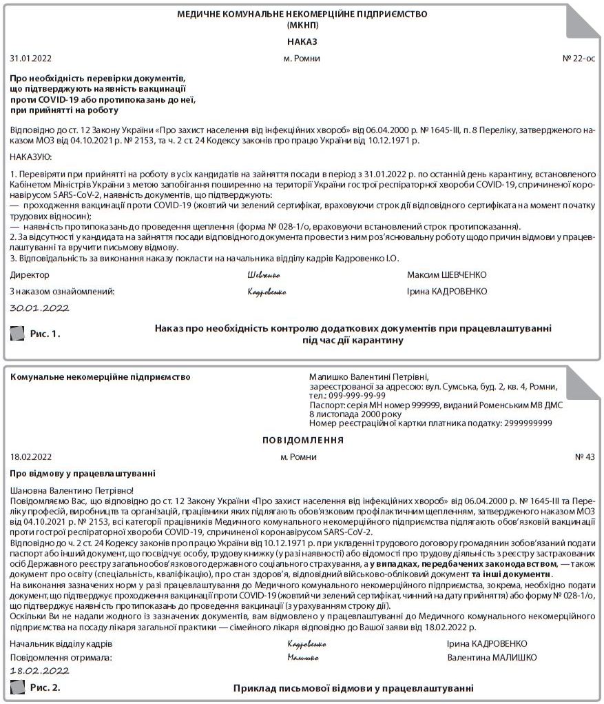 Вважаємо, що роботодавці, яким постановою № 1236 встановлені обмеження на здійснення діяльності у період карантину та можливість зняти такі обмеження за наявності у працівників вакцинації, мають право перевіряти у осіб, що приймаються на роботу, відповідний документ. На нашу думку, логіка така: в ч. 2 ст. 24 КЗпП наведено не вичерпний перелік документів, що зобов’язаний надати громадянин при укладанні трудового договору. Зокрема, у нормі передбачено, що у випадках, передбачених законодавством, громадянин має надати «інші документи». Карантин в Україні встановлено постановою № 1236 відповідно до ст. 29 Закону № 1645. Отже, і обмеження діяльності та зняття цих обмежень, передбачені постановою № 1236, є нічим іншим, як вимогами законодавства. Тож, щоб прийняти працівника на роботу у відповідній карантинній зоні, роботодавець має впевнитися у наявності в такого громадянина одного з документів, які дозволяють оминути встановлені обмеження для роботи такого працівника, зокрема, сертифіката про вакцинацію.