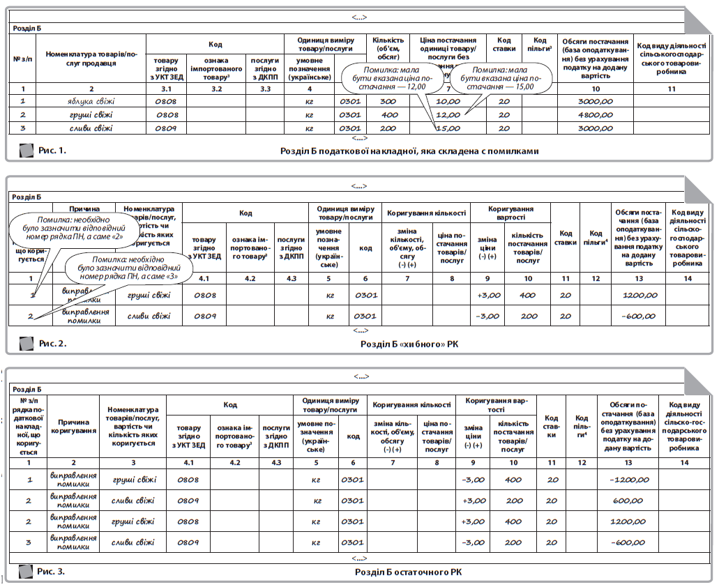 Приклад. Підприємство здійснило продаж товарів (яблука, груші, сливи). Перша подія — постачання. ПН (див. рис. 1) своєчасно складена та зареєстрована в ЄРПН. Згодом у ПН виявлено помилки, а саме: ціну постачання груш та слив зазначено неправильно. Щоб виправитися, постачальник склав та зареєстрував у ЄРПН РК (див. рис. 2), у якому помилково зазначив не порядкові номери рядків ПН, що коригується, а номери за порядком рядків такого РК. Виправитись можна, склавши ще один РК. Для цього доведеться виправляти всі «постраждалі» рядки (див. рис. 3). Реєструвати такий РК в ЄРПН має постачальник. У цьому випадку реєстрація РК не вплине на регліміт.