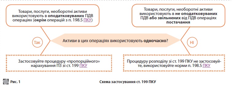 Якщо придбані та/або виготовлені товари/послуги, необоротні активи частково використовують в оподатковуваних операціях, а частково — ні, п. 199.1 ПКУ вимагає від платника податків: