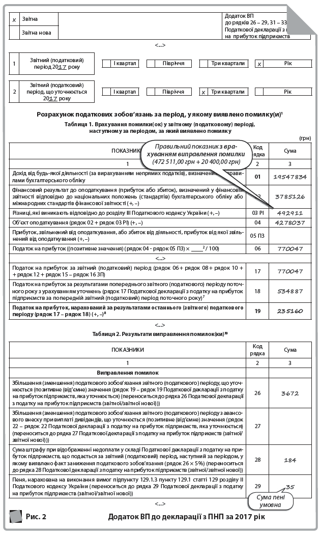 Приклад. Підприємство (квартальний платник податку на прибуток) у декларації за 3 квартали 2017 року невірно визначило залишкову «податкову» вартість ліквідованого основного засобу: у ряд. 1.2.2 додатка РІ помилково вказали 100700,00 грн замість 80300,00 грн. Це, у свою чергу, призвело до заниження значення ряд. 03 РІ декларації та, відповідно, об’єкта оподаткування (ряд. 04 декларації) на 20400,00 грн. Дані звітної декларації за 3 квартали 2017 року (з помилкою), а також за 2017 рік (показник ряд. 03 РІ наведено після виправлення помилки наростаючим підсумком) див. у табл. 3.
