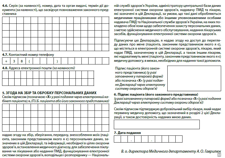 4) на підставі документів та інформації, наданих пацієнтом (його законним представником), уповноважена особа зобов’язана заповнити Декларацію в електронній формі, роздрукувати її та надати пацієнту (його законному представнику);