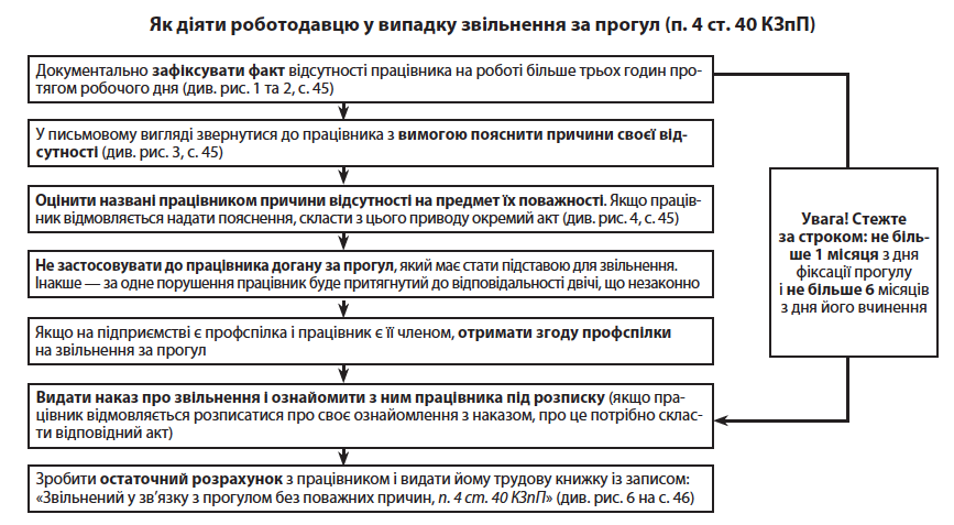 - Роботодавцю слід запастися необхідними доказами, що підтверджують відсутність працівника на роботі протягом певного періоду часу (доповідна записка, акт про відсутність працівника на роботі, табель обліку використання робочого часу; див с. 45).