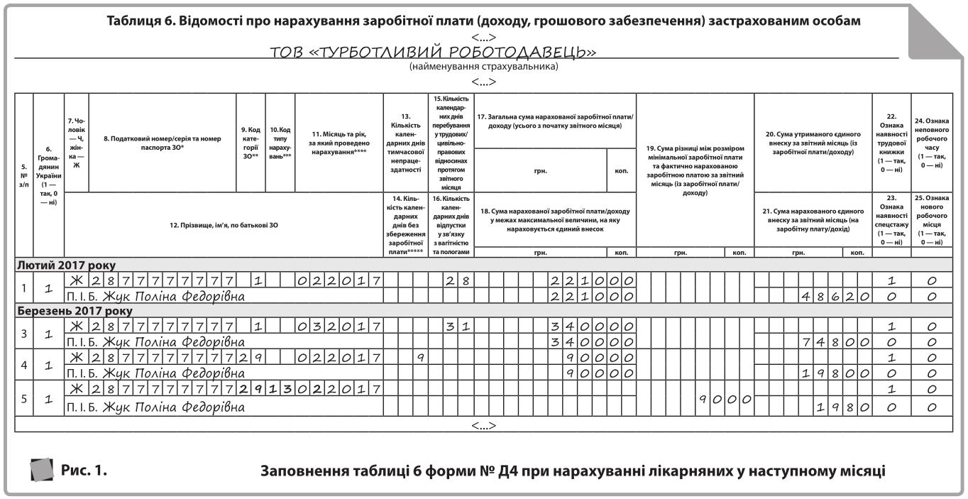 Далі на рис. 1 покажемо, як заповнити таблицю 6 форми № Д4 за лютий і березень 2017 року.