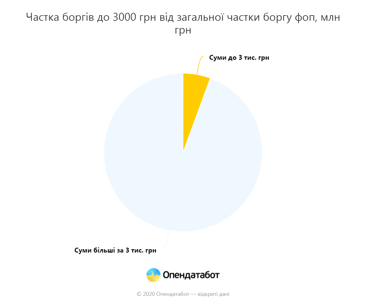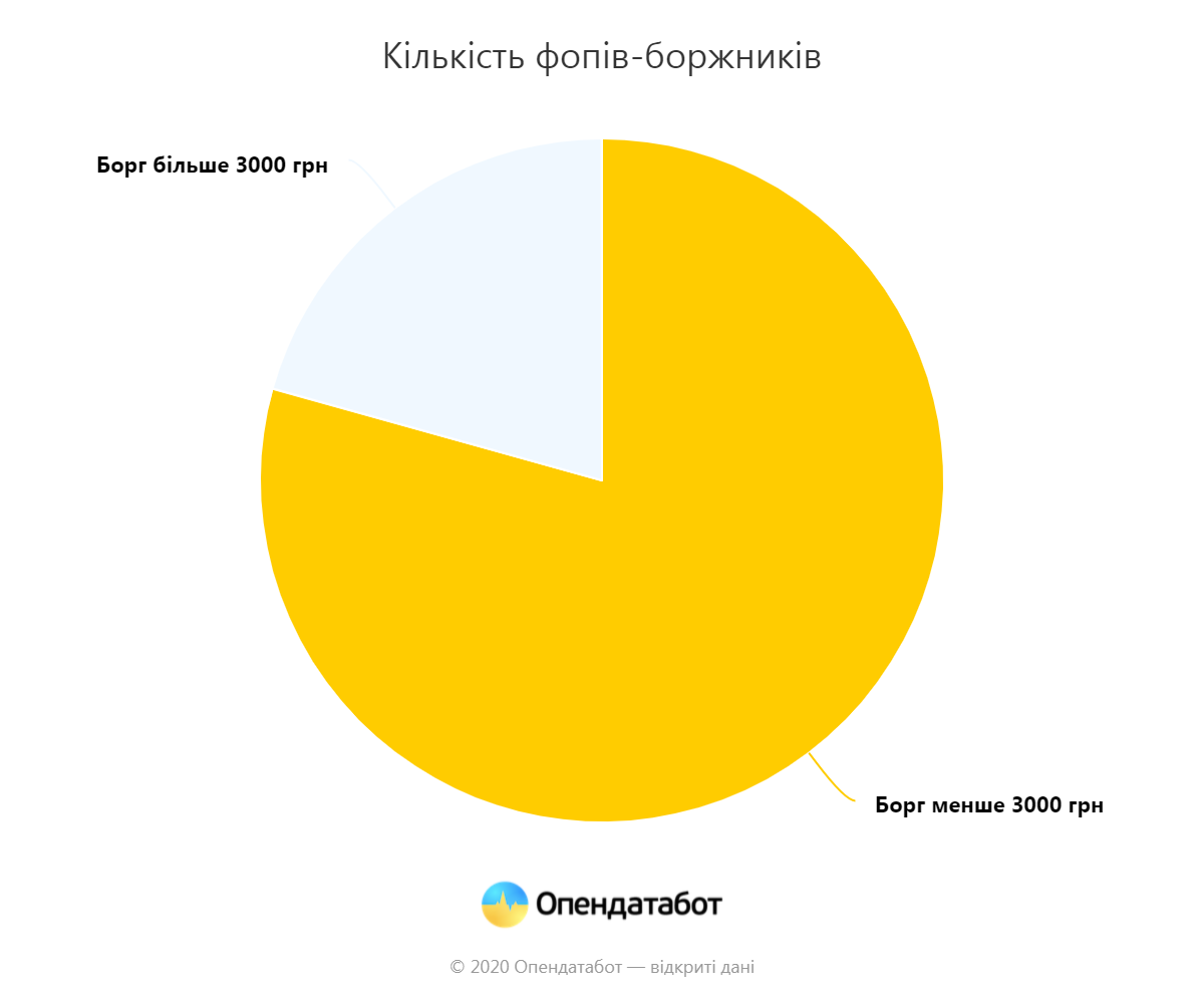 Станом на зараз 735 тисяч фопів мають податковий борг менший за 3000 грн, 110 тисяч — від 3 до 10 тисяч гривень, 75 тисяч — від 10 тисяч до 100 тисяч гривень. Ще 6 669 підприємств заборгували податків на суму від 100 000 гривень.