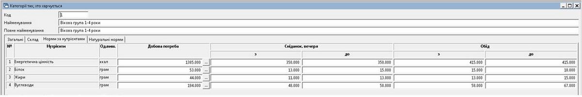 • граничні норми добової калорійності для відповідної енергетичної та поживної (кількість білків, жирів та вуглеводів) цінності;