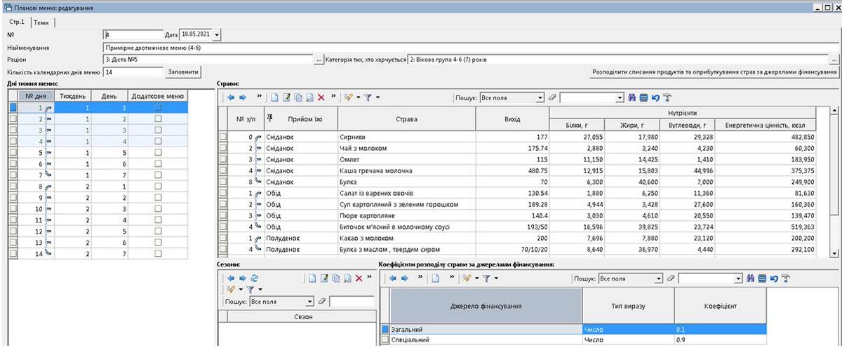 У програмі «Дебет Плюс» реалізовані примірне одно-/дво-/чотиритижневе сезонне меню та щоденне меню-розклад, якими передбачено врахування особливих дієтичних потреб здобувачів освіти/дітей (у разі наявності), сезонність (осінь, зима, весна, літо), наявні харчові продукти, порції страв для різних вікових груп, а також відповідність вимогам санітарного законодавства та нормам харчування.