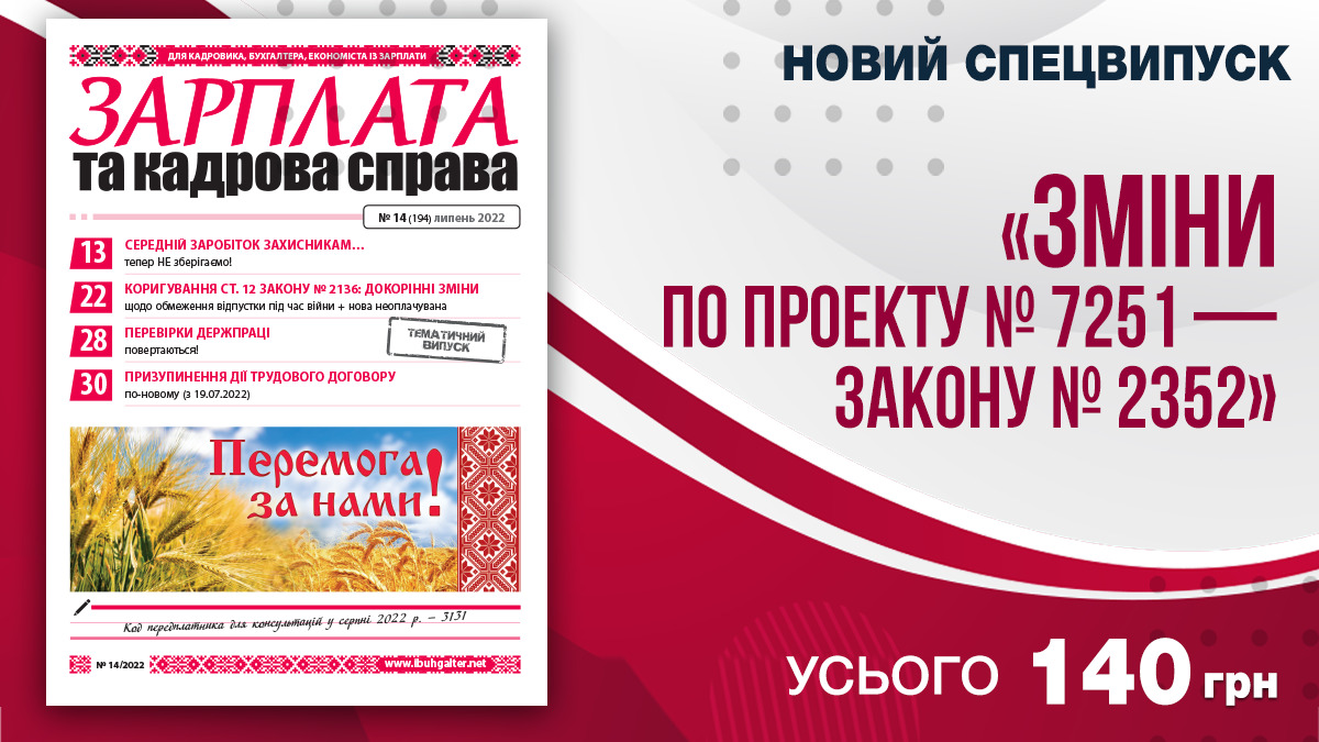 Сьогодні газета «Зарплата та кадрова справа», яка є флагманом у сфері зарплатно-кадрових роз’яснень, підготувала для Вас тематичний випуск, який висвітлює зміни щодо проекту № 7251 — Закону № 2352