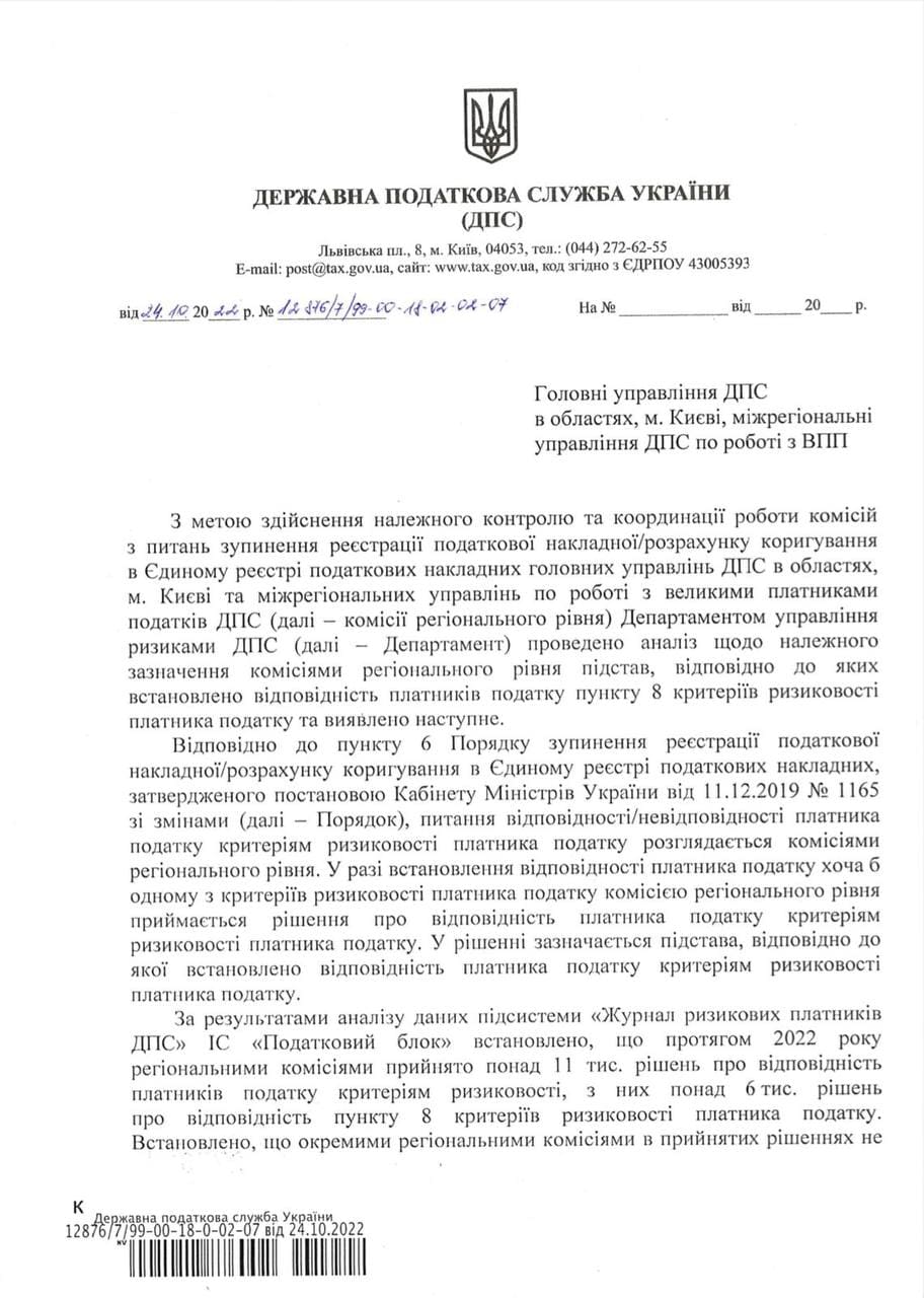 Наразі ДПС прийняла рішення, відповідно до якого регіональні ДПС вказуватимуть детальну інформацію та обґрунтування підстав прийняття рішень про відповідність п.8 критеріїв ризиковості платників.  Детальніше про це — в листі ДПС нижче.