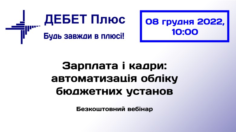 У четвер, 08 грудня 2022 року, о 10:00 відбудеться вебінар для бюджетних установ від компанії-розробника програмного забезпечення «Дебет Плюс» для автоматизації бухгалтерського, оперативного та фінансового обліку для України.