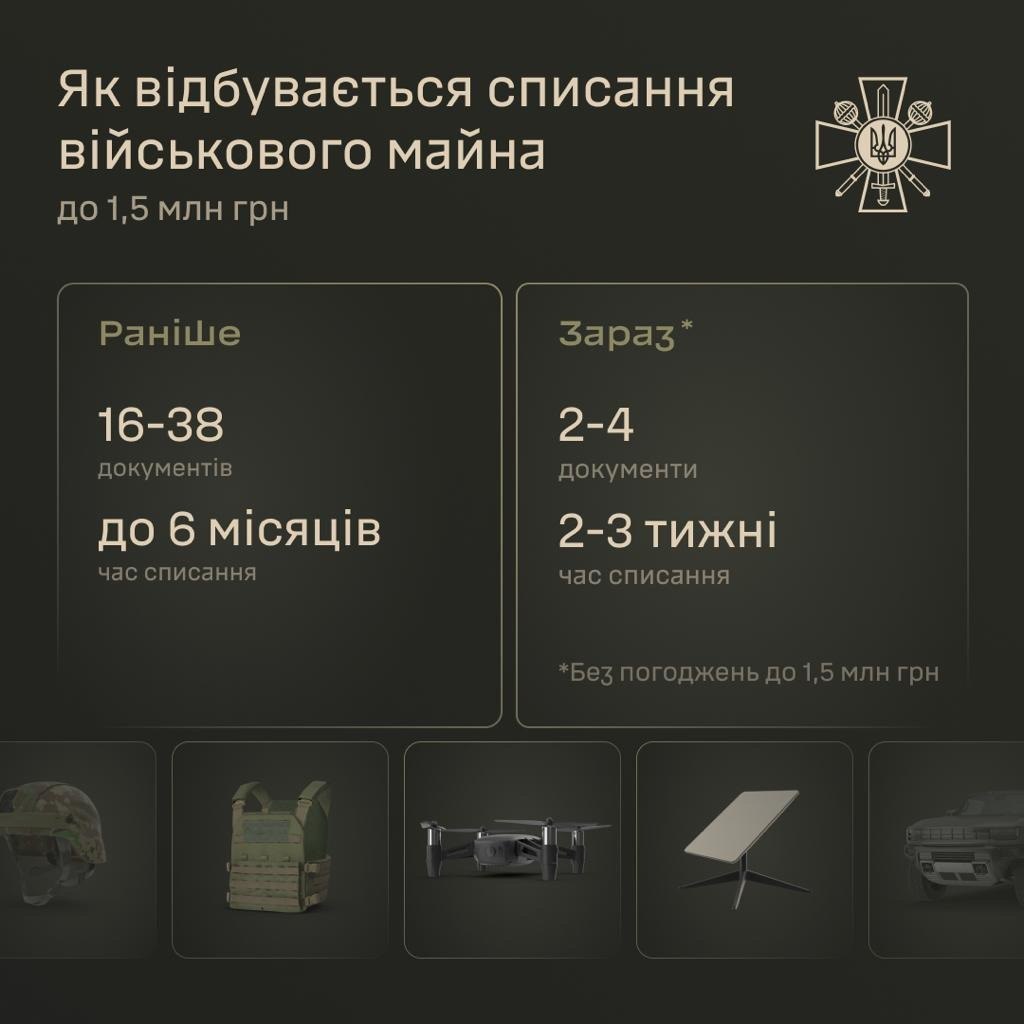 Наприклад, раніше на списання дрона йшло від одного місяця до півроку. Для цього потрібно було зібрати до 40 документів. Ухвалені зміни скоротять процедуру до 2-3 тижнів. Техніку вартістю до 1,5 мільйонів гривень зможуть списувати командири рот, батальйонів чи бригад.