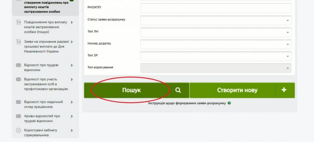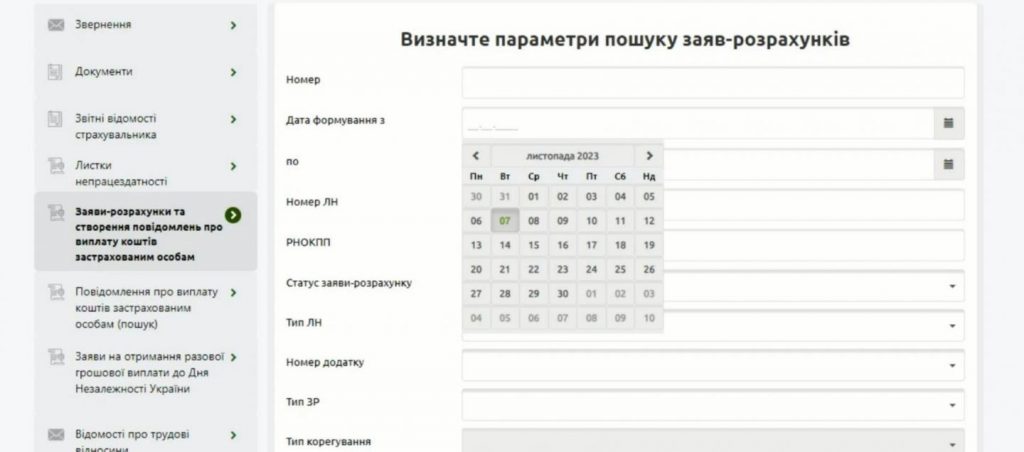 2. У новому вікні визначте параметри пошуку заяв-розрахунків, за якими потрібно подати повідомлення про виплату коштів, обравши необхідний критерій: період їх формування чи номер листка непрацездатності.