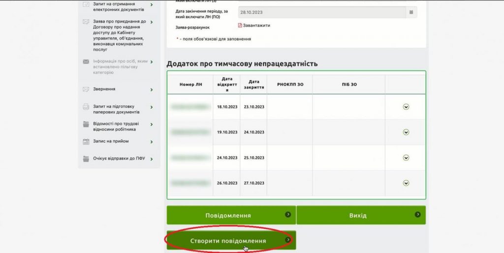 5. В полі “Додаток про тимчасову непрацездатність”, оберіть потрібний лікарняний та натисніть копку “Створити повідомлення”.