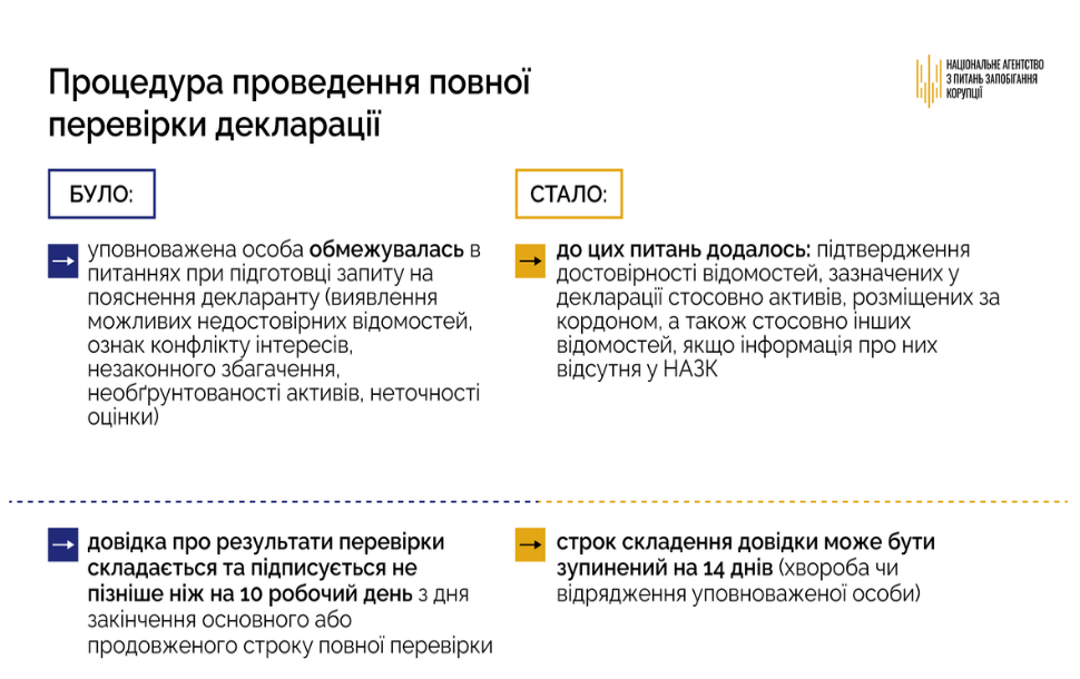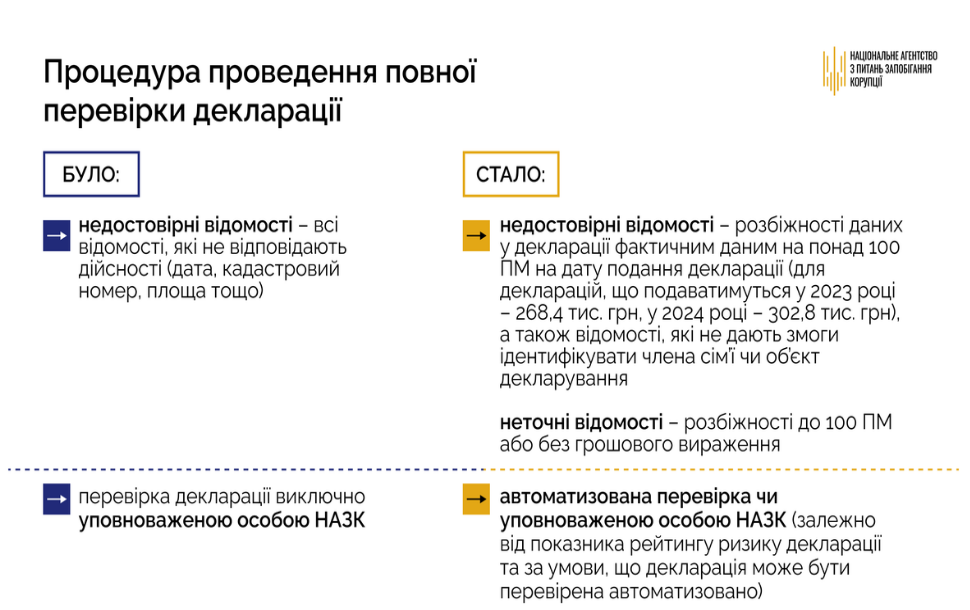 “Ми маємо запит від декларантів - процедура повної перевірки має стати для них не обтяжливою. Саме тому, НАЗК внесло зміни до Порядку проведення повних перевірок, розмежувавши недостовірні та неточні відомості, залежно від розміру виявлених розбіжностей у декларації. До 100 прожиткових мінімумів (для декларацій, поданих у 2023 році, - це не більше 268,4 тис.грн, у 2024 році - 302,8 тис.грн) - це неточні відомості, більше 100 прожиткових мінімумів - недостовірні. Про зазначені неточні відомості у декларації ми не будемо запитувати пояснень декларанта. Разом з тим, на запит уповноваженої особи декларант буде зобов’язаний надати копії документів, що підтверджують достовірність зазначених відомостей, якщо вони відсутні у розпорядженні НАЗК. Надати пояснення як і раніше залишається правом декларанта. Для спрощення процедури заповнення декларації та уникнення в ній помилок НАЗК розробило функцію “Дані для декларації” в Реєстрі декларацій”, - зазначила Юлія Кулікова.