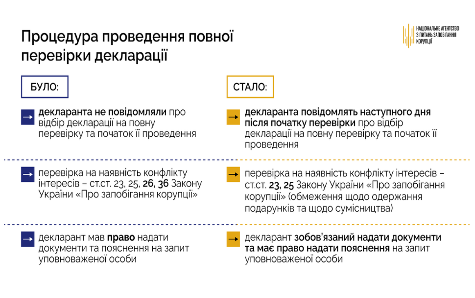 “НАЗК змінює підхід до відбору та перевірок декларацій. Раніше НАЗК мало обов’язок щорічно перевіряти декларації всіх топ-посадовців, тому на повну перевірку відбирало декларації залежно від категорії посади, у першу чергу Президента України, міністрів, народних депутатів, суддів Конституційного Суду України, Верховного Суду. Понад 99% декларацій були не охоплені системним контролем НАЗК, а перевірка службовців інших посад була можлива лише за зверненням громадян, матеріалами журналістських розслідувань або у межах співпраці з правоохоронними органами. Як результат, ми не реалізовували очікування суспільства з перевірок декларацій. Тож, що змінилося. Відтепер відбір декларацій буде здійснюватись за результатами оцінки ризиків декларації, тобто залежно від показника рейтингу ризику. Це стало можливим оскільки в Закон України “Про запобігання корупції” внесено зміни та виключено обов’язок перевіряти щорічно всі декларації топ-чиновників, що дало можливість фактично змінити підхід до відбору декларацій на перевірку за ризик-орієнтованим принципом”, - зазначив Артем Ситник.