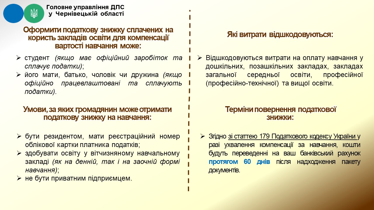 Фахівці Головного управління ДПС у Чернівецькій області інформують, що відповідно до ст. 166 Податкового кодексу України (далі – ПКУ) платник податку має право на податкову знижку за наслідками звітного податкового року.