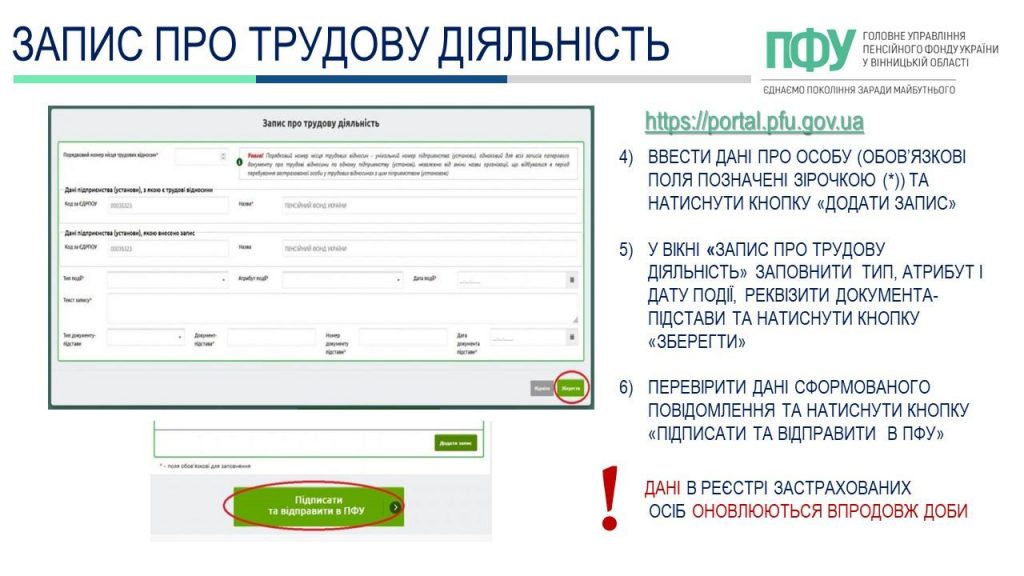6. Перевірити дані сформованого повідомлення та натиснути кнопку «Підписати та відправити в ПФУ».