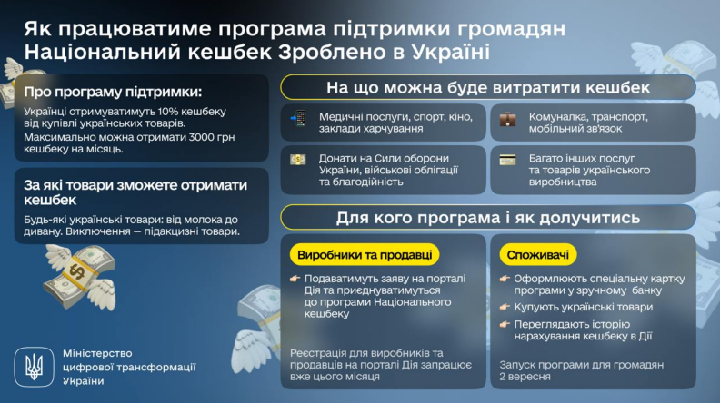 Українці отримуватимуть до 3 тисяч гривень компенсації за купівлю товарів локального виробництва щомісячно. Уряд дав старт Національному кешбеку — програмі підтримки громадян під час війни від Мінекономіки, ініційованій Президентом.