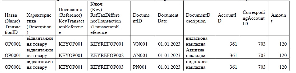На практиці, до одного TransactionID може бути більше ніж один DocumentID, а в схемі зазначено, що TransactionID має обов’язковість Mandatory, повторення 1…1, тобто для того щоб вивести інформацію в розрізі документу, потрібно вивести більше ніж один раз TransactionID.