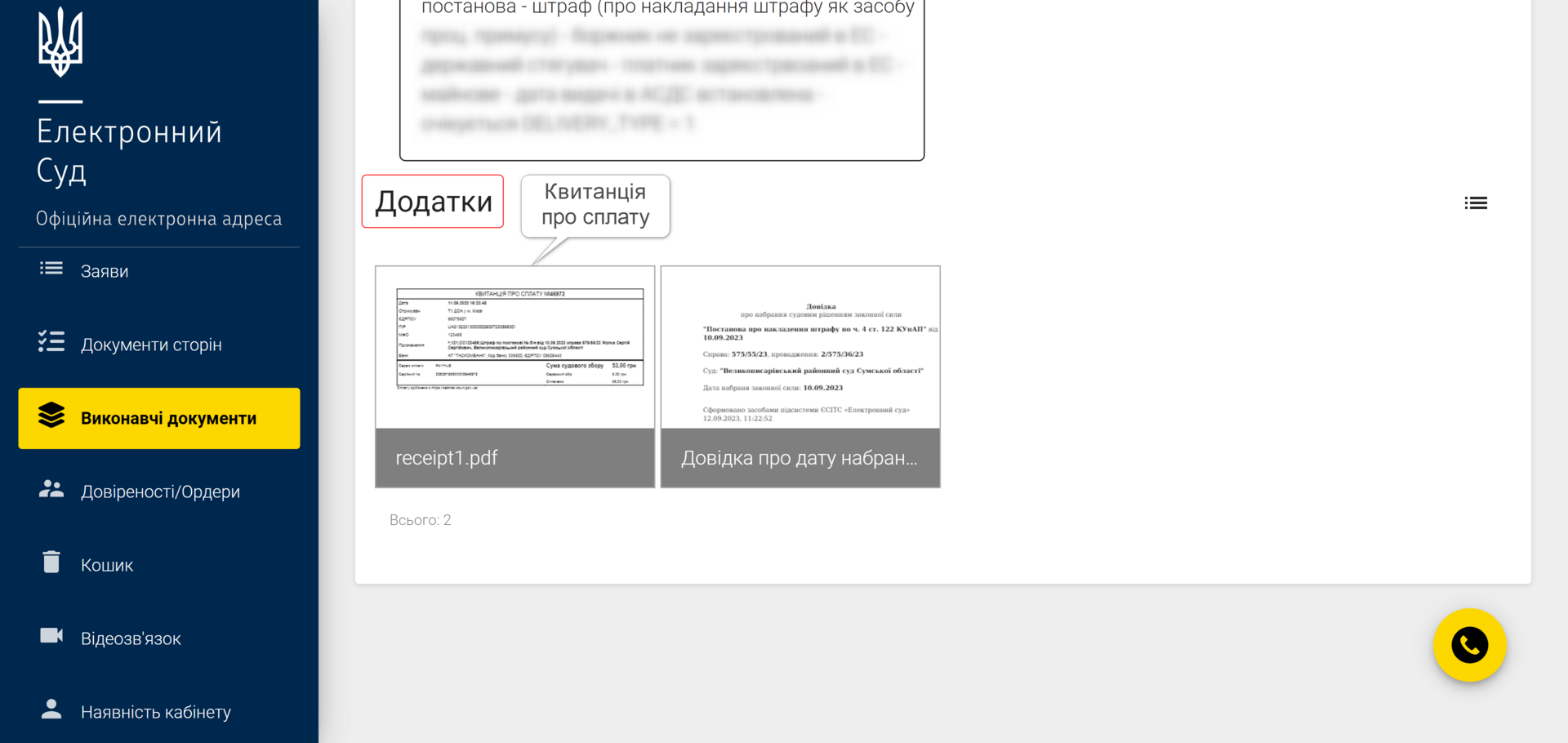 - Квитанції стають доступні одразу після успішної оплати та відображаються як додатки до виконавчого документа.