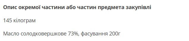 Замовник проводить закупівлю на 100 кілограмів масла, та зазначає фасування 200 грамів. Ціна, яку вказує постачальник буде за 1 кг, а не за певний вид фасування, що вказує замовник.