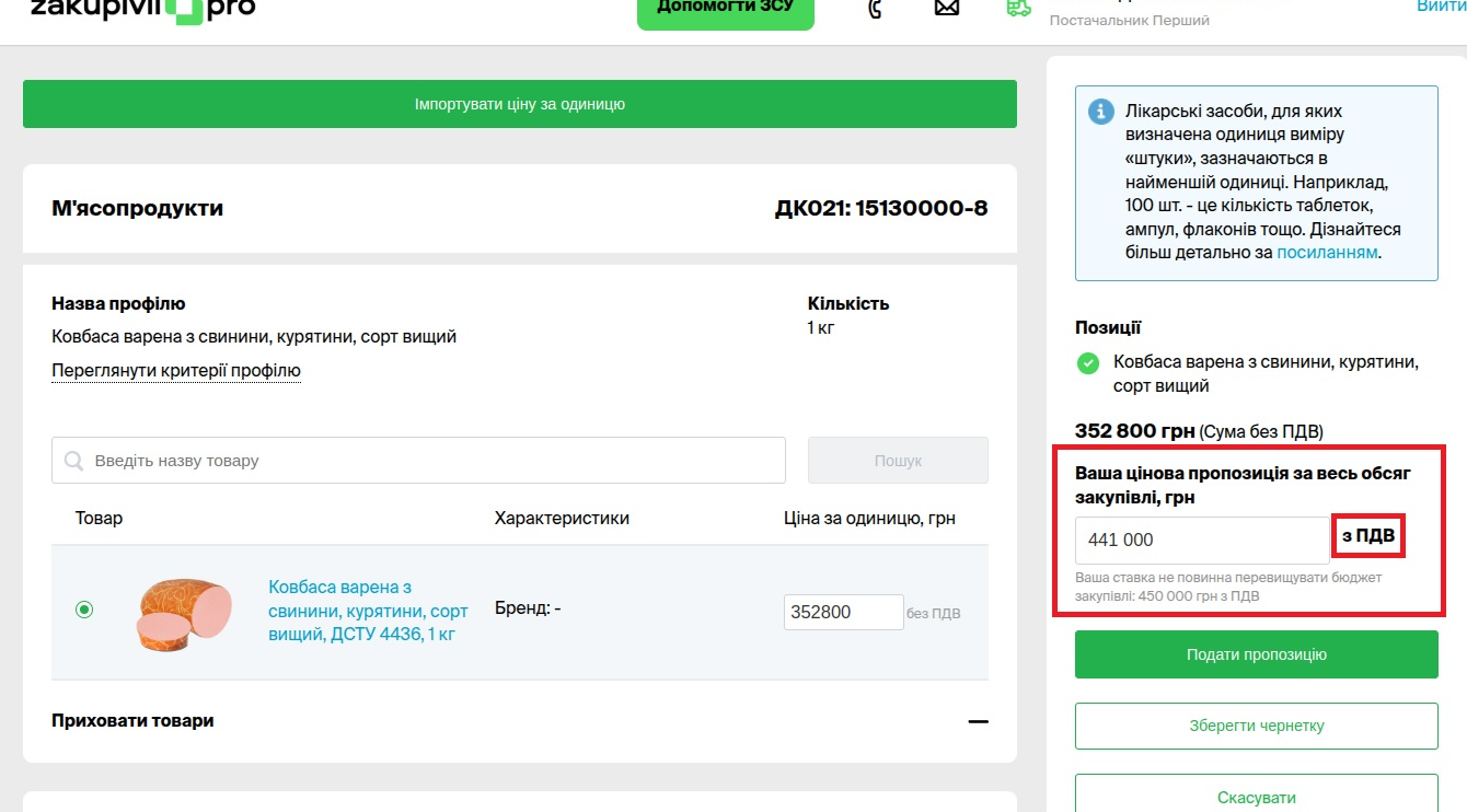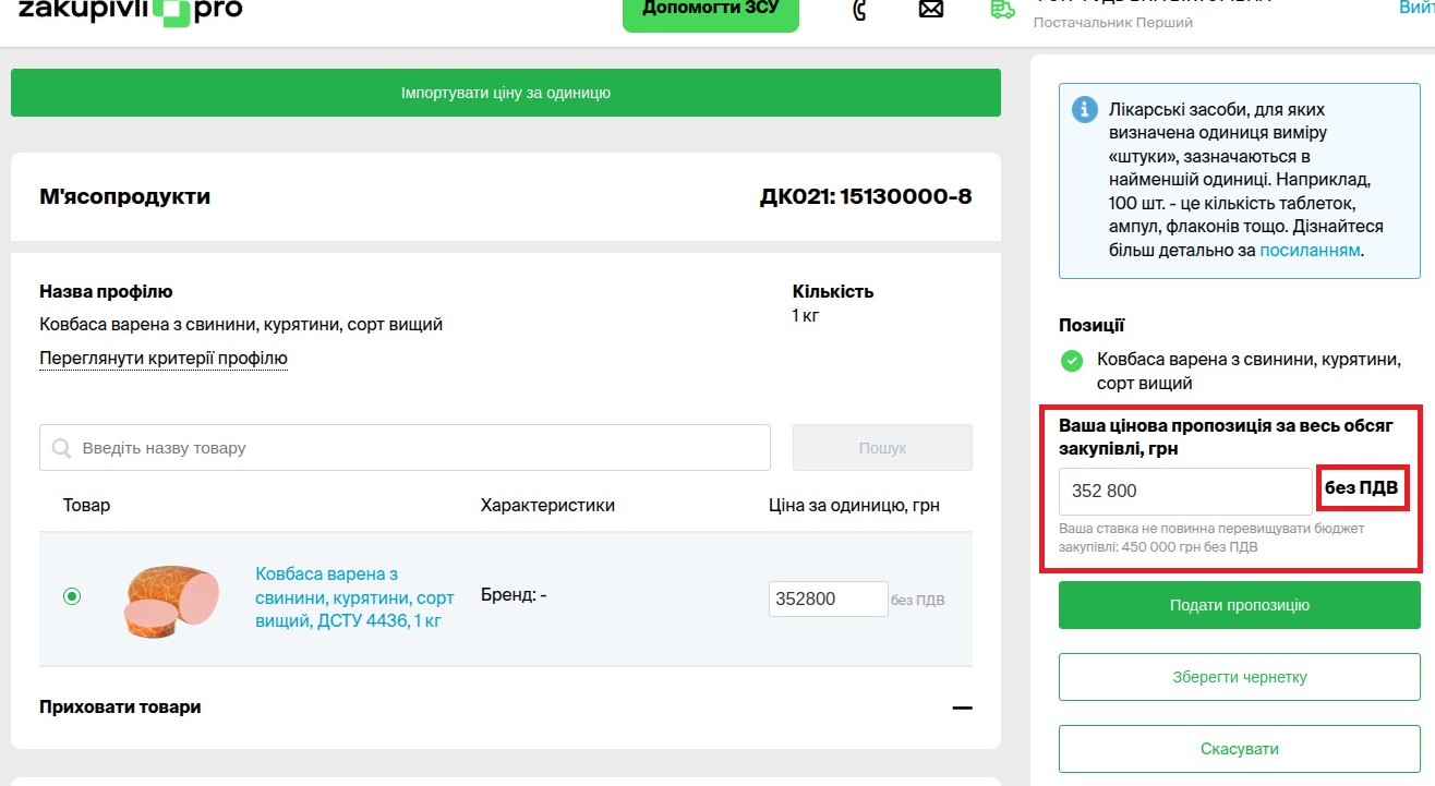 Ситуація аналогічна до попередньої. Під час подачі цінової пропозиції постачальник, маючи інформацію про очікувану вартість в особистому кабінеті, робить висновки, що в такому випадку потрібно подавати свою пропозицію також без ПДВ, оскільки оцінюватись вона буде саме без нього (приклад нижче на картинці).