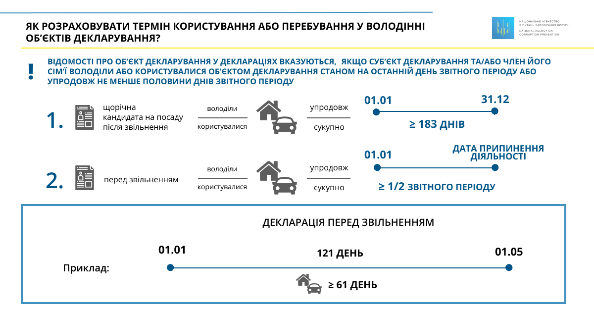 Представники Департаменту перевірки декларацій та моніторингу способу життя НАЗК повідомили: залежно від типу заповнюваної декларації термін користування або володіння об’єктами декларування розраховується по-різному. Так, при заповненні щорічної декларації, декларації кандидата на посаду та декларації після звільнення відомості про об’єкт декларування вказуються, якщо суб’єкт декларування, член його сім’ї володіли/користувалися таким об’єктом станом на 31 грудня або упродовж не менше половини днів звітного періоду – від 1 січня до 31 грудня не менше, ніж 183 календарні дні сукупно.