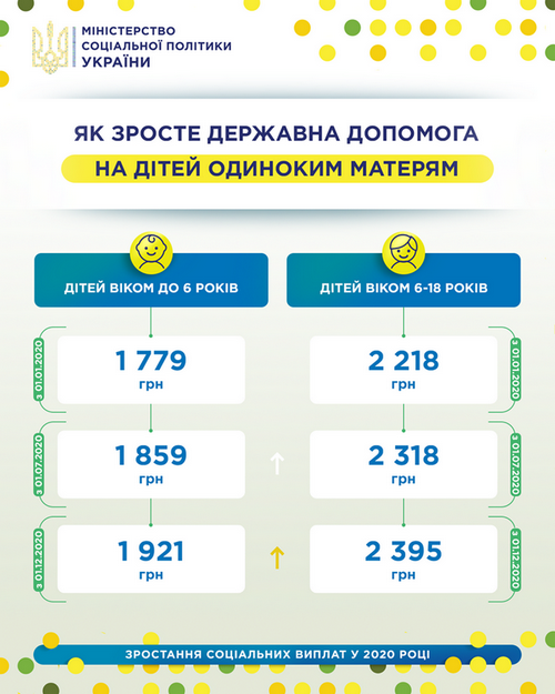 Міністерство соціальної політики України на своїй сторінці у Facebook навело інфографіку, в якій показано, як зросте державна допомога на дітей одиноким матерям у 2020 році.