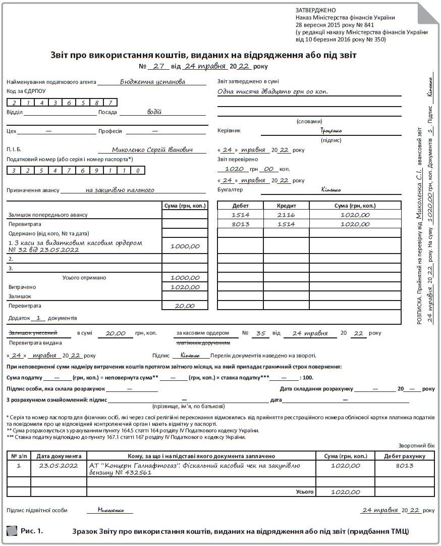 Приклад 1. Із каси установи (неплатника ПДВ) видали підзвітній особі (водію) кошти в сумі 1 000,00 грн для придбання пального для автомобіля. Водій придбав на всю суму пальне й надав до бухгалтерії чек, що підтверджує вартість придбаного пального, та Звіт про використання коштів, виданих на відрядження або під звіт, на суму 1 020,00 грн. З каси установи було відшкодовано перевитрати підзвітної особи.
