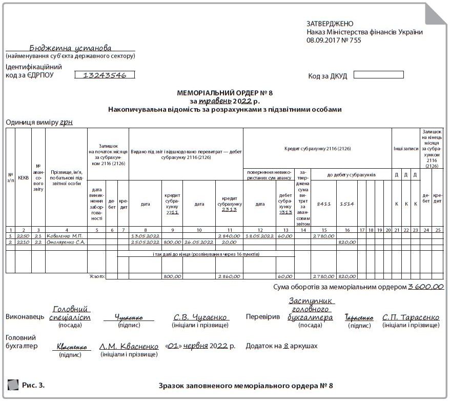 У кожному меморіальному ордері, відкритому установою, слід відображати суми окремо за кожною підзвітною особою та за КЕКВ. До меморіального ордера № 8 заносять записи про: видачу грошових коштів під звіт (готівку або перерахування на картку); авансові суми, які підзвітні особи не використали й повернули в касу або на рахунок установи; витрачені суми авансу й затверджені суми витрат згідно зі Звітом.