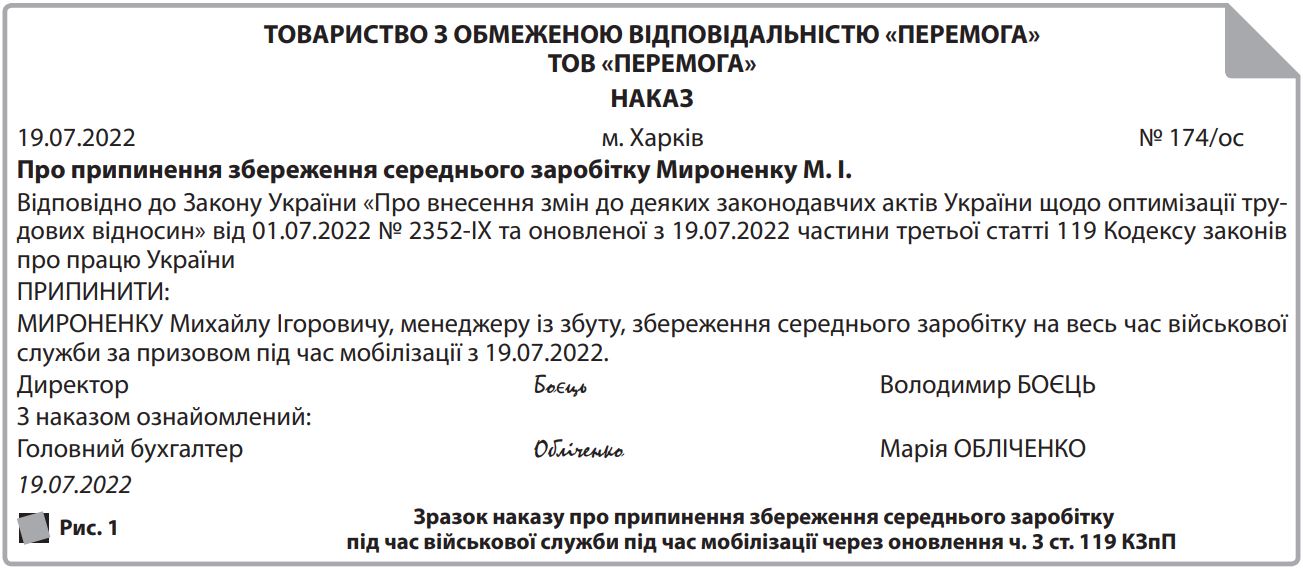 Чи потрібно наразі, після набуття чинності змінами у законодавстві, видавати наказ (розпорядження) про припинення збереження середнього заробітку? Нагадаємо, що перед початком служби було видано наказ (розпорядження) про увільнення працівника від роботи зі збереженням місця роботи, посади і середнього заробітку (як це було сформульовано у нормі ч. 3 ст. 119 КЗпП на дату початку служби). На нашу думку, так: роботодавець має видати окремий наказ (розпорядження), у якому зазначити, що з 19.07.2022 р. припиняється збереження середнього заробітку на період військової служби. Зразок такого наказу наведено на рис. 1. На нашу думку, зміст даного наказу варто довести до відома працівника, який служить, будь-яким доступним способом (наприклад, засобами електронного зв’язку тощо). Якщо з цим проблема, то все одно середній заробіток з 19.07.2022 р. не зберігаємо.
