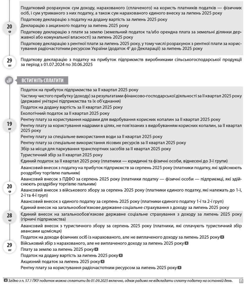 - сплати податків припадає на вихідний або святковий день, останнім днем сплати вважатиметься операційний (банківський) день, що настає за таким вихідним або святковим днем (п. 57.1 ПКУ);