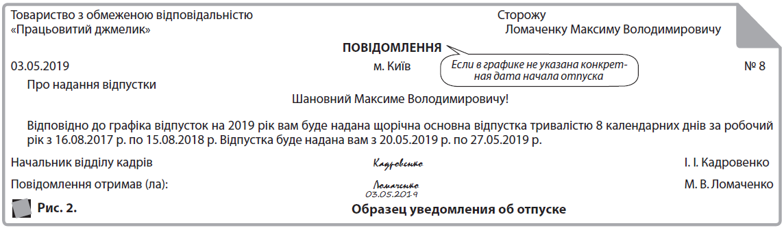 ПРИМЕЧАНИЕ РЕДАКЦИИ. Ваш подход верен наполовину. В этом случае работник уведомлен только о месяце предоставления отпуска, а вот конкретная дата остается «открытой». Вместе с тем, конкретный период предоставления ежегодных отпусков в рамках, установленных графиком, согласуется между работником и работодателем, который обязан письменно уведомить работника о дате начала отпуска не позднее чем за две недели до установленного графиком срока (ч. 5 ст. 79 КоАП; ч. 11 ст. 10 Закона об отпусках). Поэтому мало ознакомить работника с графиком, необходимо уведомить его о конкретной дате начала отпуска. Пример уведомления о начале ежегодного отпуска мы привели на рис. 2.