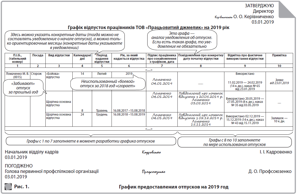 ПРИМЕЧАНИЕ РЕДАКЦИИ. График составляют в произвольной форме, поэтому вы вправе оформлять его на свое усмотрение (наш вариант приведен на рис. 1). Кроме того, в течение года, действительно, разрешено вносить изменения в график. В частности, «переписывать» отпускное расписание в течение года приходится из-за совместителей, «льготников»1 и работников-новичков. Что неправильно? Во-первых, КЗоТ и Закон об отпусках обязуют составлять график для ежегодных основных и дополнительных отпусков. Но! По нашему мнению, в график целесообразно «забить» все виды оплачиваемых и обязательных отпусков, на которые имеют право работники, кроме не поддающихся планированию (например, учебный отпуск), + накопленные отпуска за прошлые годы. Совет: целесообразнее вначале предусмотреть те виды отпусков, которые не переносятся на следующий год2, чтобы работник не утратил на них право. Во-вторых, можно сразу предусмотреть деление ежегодного отпуска на части. Но учтите, что основная часть отпуска должна быть не менее 14 к. дн. Напоминаем: праздничные и нерабочие дни при определении продолжительности ежегодных отпусков и допотпусков «на детей» не учитывают.