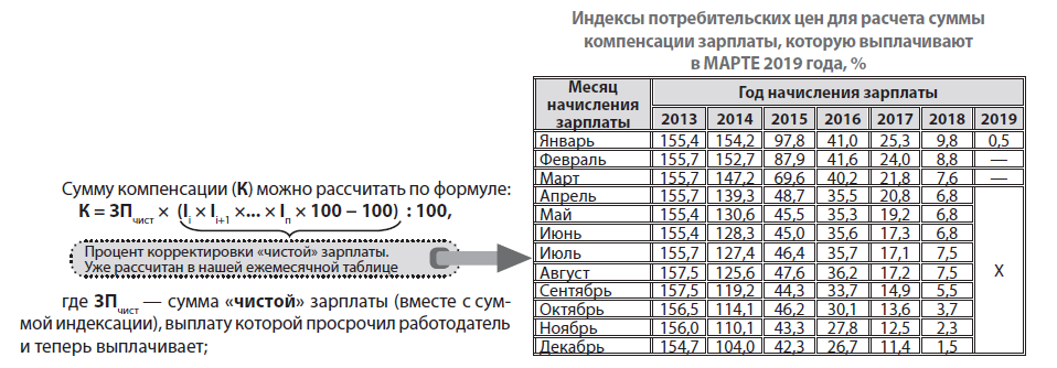 4) если в месяце выплаты задолженности индекс потребительских цен (далее — ИПЦ) нарастающим итогом превысил 100 %, работодатель должен начислить компенсацию. Если ИПЦ менее 100 %, компенсацию не начисляют, а выплачивают только задолженность;