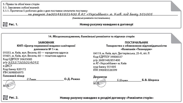 - якщо змінений реквізит (номер рахунку) прописано в «тілі» договору (див. рис. 1), слід обов’язково скласти додаткову угоду і викласти вказаний пункт договору в актуальній редакції. Однак таке буває нечасто. Здебільшого банківські реквізити вказують у кінці документа, у місці проставлення печатки (див. наступний пункт);