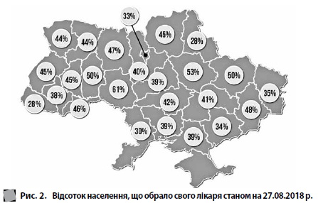 Додатково, за договорами з НСЗУ, заклади отримують по 240 грн за пацієнта, який проживає на території обслуговування закладу, але ще не підписав декларацію про вибір лікаря. При цьому від загальної кількості таких пацієнтів щомісячно будуть вираховуватися люди, які підписуватимуть декларації з лікарями. Важливо пам’ятати, що додаткова оплата за пацієнтів, які проживають на території обслуговування закладу, діятиме лише під час перехідного періоду. Тому раджу всім медичним закладам не зволікати та активно боротися за своїх пацієнтів. Перешкод для цього я не бачу, адже українці швидко приєднуються до реформи первинної медицини. Станом на 27 серпня свого терапевта, педіатра та сімейного лікаря обрали понад 16 млн українців — це майже 40 % населення країни (рис. 2).