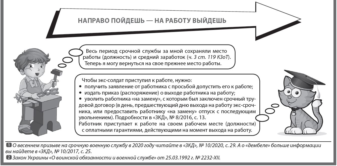 В соответствии с Указом Президента Украины от 16.01.2020 г. № 13/2020 в октябре-декабре 2020 года будут уволены в запас из Вооруженных Сил Украины, Государственной специальной службы транспорта, других образованных в соответствии с законами Украины воинских формирований (1) военнослужащие срочной службы, имеющие степень высшего образования специалист или магистр, а также (2) другие военнослужащие срочной службы, которые отслужили установленные сроки срочной военной службы. Помните, как в «ЗКД», № 19/2018, с. 42, Петенька мечтал стать солдатом1? А теперь представим, что маленький патриот закончил срочную службу и перед ним стоит выбор. Но как говорится: в каждой сказке есть доля сказки...