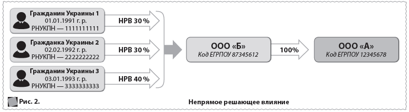 2. Непрямое решающее влияние. Здесь может быть несколько вариантов (с возможными вариантами можно ознакомиться в примерах на сайте Минфина). Закон № 361 определяет непрямое решающее влияние, в частности:
