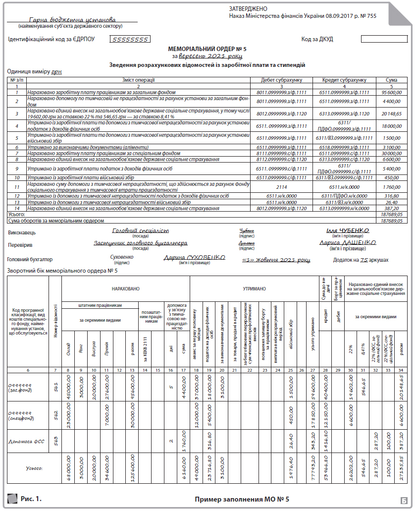 Типовая форма мемориального ордера (далее — МО) № 5 «Зведення розрахункових відомостей із заробітної плати та стипендій», а также соответствующая ей форма для автоматизированного ведения бухучета № 5-авт, утверждены приказом МФУ от 08.09.2017 г. № 755.